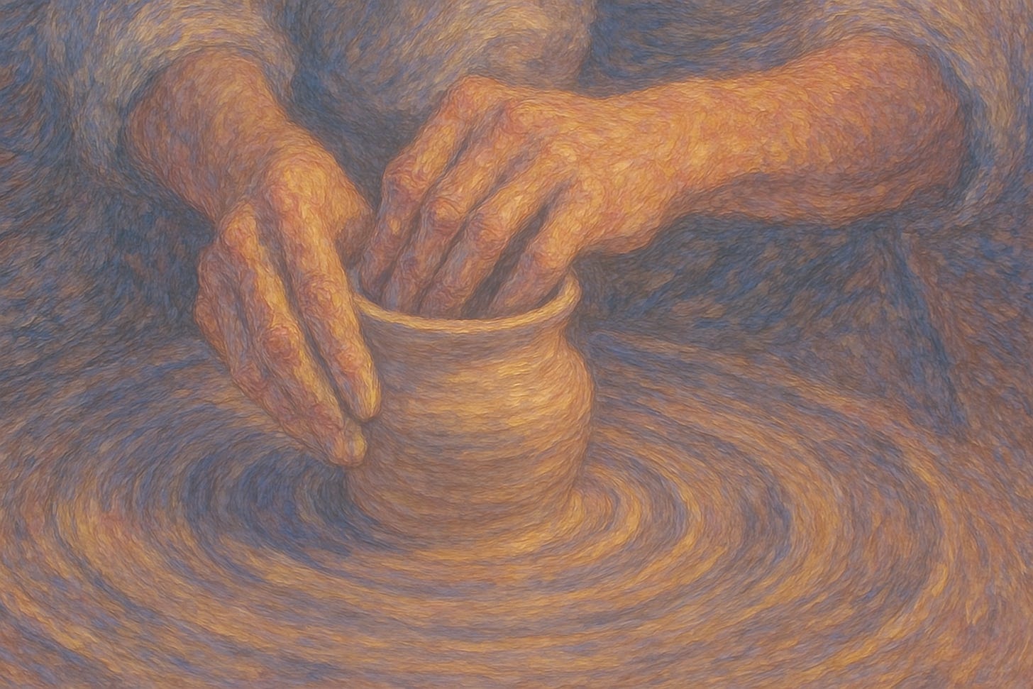Hands sculpting clay on a pottery wheel, focused and fluid, with soft lighting highlighting the detail of the process