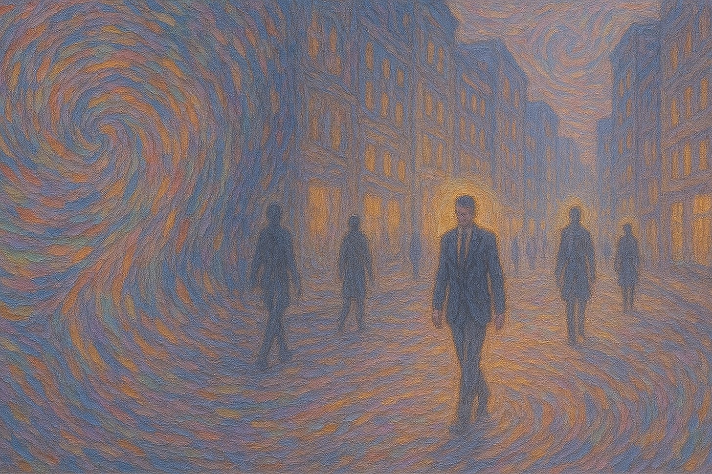 An abstract painting gradually blending into a city street scene, where people are walking with intention—each person lit by a soft halo suggesting they are creators of their own paths