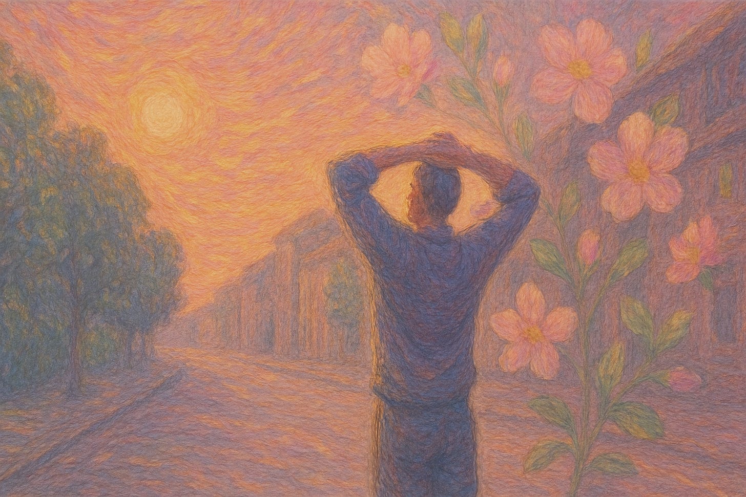 Someone standing at sunrise on a quiet street, stretching and breathing in the morning air, with a subtle overlay of blooming flowers suggesting growth and potential